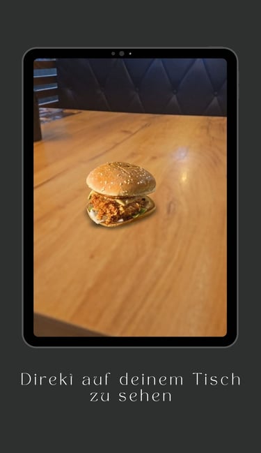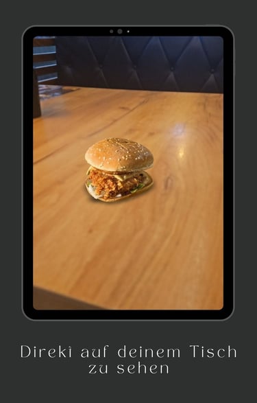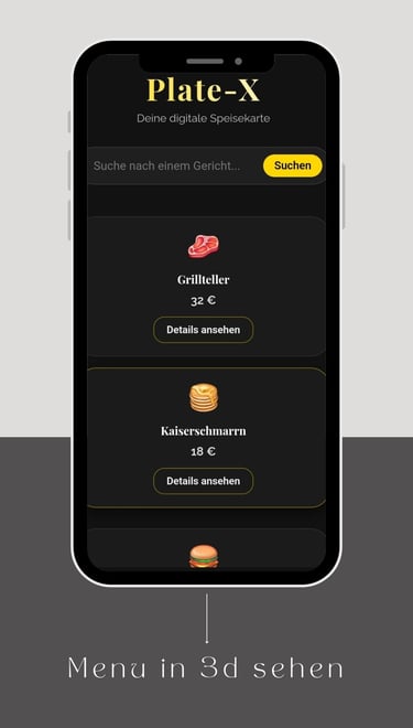 Der Gast kommt ins Restaurant, nimmt Platz und scannt den QR-Code auf dem Tisch mit seinem Smartphone. Sofort erscheint eine beeindruckende 3D-Darstellung der Hauptgerichte direkt auf der Tischoberfläche – realistisch, detailreich und aus verschiedenen Perspektiven betrachtbar.